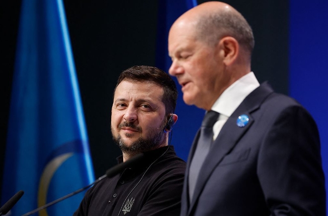 2024年6月11日,乌克兰总统泽连斯基在德国柏林参加当天开幕的乌克兰重建会议。(视觉中国)