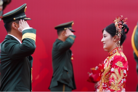 东方欲晓、晨曦初露。清晨的营区处处洋溢着喜庆浪漫的气息,化妆师正在精心为新娘们梳妆打扮,20位新娘将以最美丽的妆容和甜蜜的心情,翘首等待自己的爱人,喜悦之情溢于言表。寓意吉祥如意、百年好合的秀禾服映衬着精致的妆容,迎接作为属于军嫂的高光时刻。 “老婆,我来接你啦!”上午8时,新郎们手捧鲜花、笑容满面,在酒店楼前蓄势待发。团扇遮面找新娘、投壶……新娘的亲友团为新郎们设下“重重考验”,互动小游戏层出不穷,现场欢声笑语不断。新郎们一路“过关斩将”,突破层层考验,成功抱着新娘登上婚车,一同驶向幸福的殿堂。