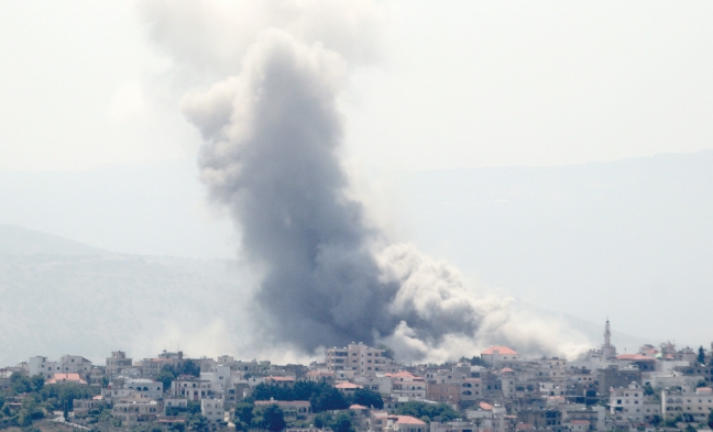 19日,黎巴嫩南部希亚姆遭以军空袭后冒出浓烟。(法新社)
