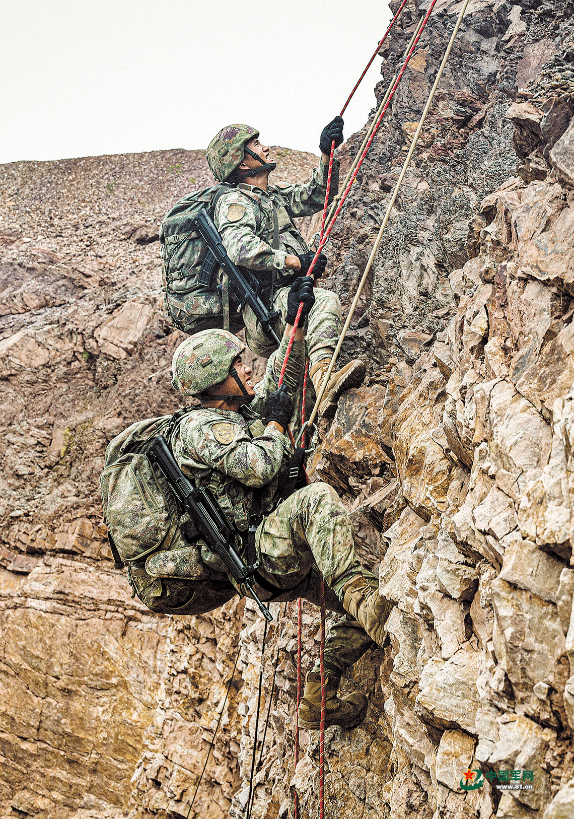 借助绳索翻越山崖。