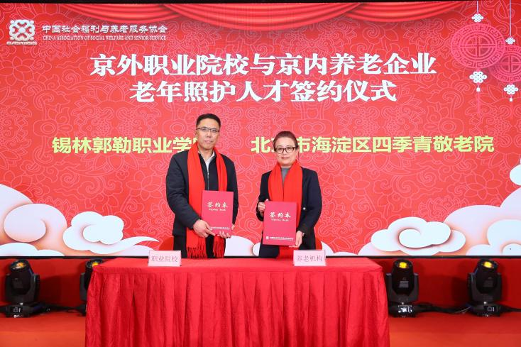 会上,来自北京市海淀区四季青敬老院、北京首开寸草养老服务有限公司、泰康之家燕园(北京)养老服务有限公司、新华家园养老服务有限公司四家养老企业的代表,分别与锡林郭勒职业学院、承德护理职业学院、长沙民政职业技术学院、呼伦贝尔职业技术学院四家院校的代表进行了签约。接下来他们将通过联合制定适合企业需求的教学实践方案和实训实习方案,通过精准的人才培养来解决北京市养老企业的“招人难”“留人难”“用人荒”等问题。