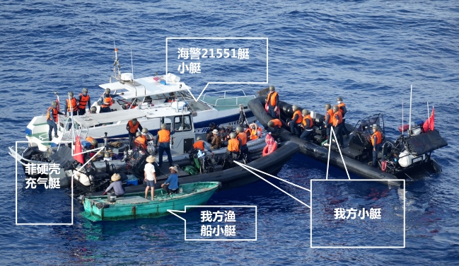 《环球时报》记者获取的现场影像显示,面对执意顽抗的菲军船艇,中国海警出动橡皮艇和冲锋舟以前后“夹击”的方式,强制驱离菲军的运补小艇。此外,中国海警执法人员还登临菲军的运补硬壳充气艇开展检查工作,并在菲方小艇上搜出防弹衣等物品。部分菲方人员配合检查。
