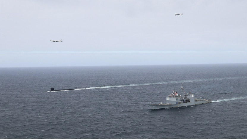 据美国“战区”网站6月25日报道,美国海军俄亥俄级弹道导弹核潜艇“田纳西”号近日在挪威海与提康德罗加级巡洋舰“诺曼底”号一同巡航,这次十分罕见的武力展示还包括空中的一架E-6B“末日飞机”和一架P-8A“海神”巡逻机。