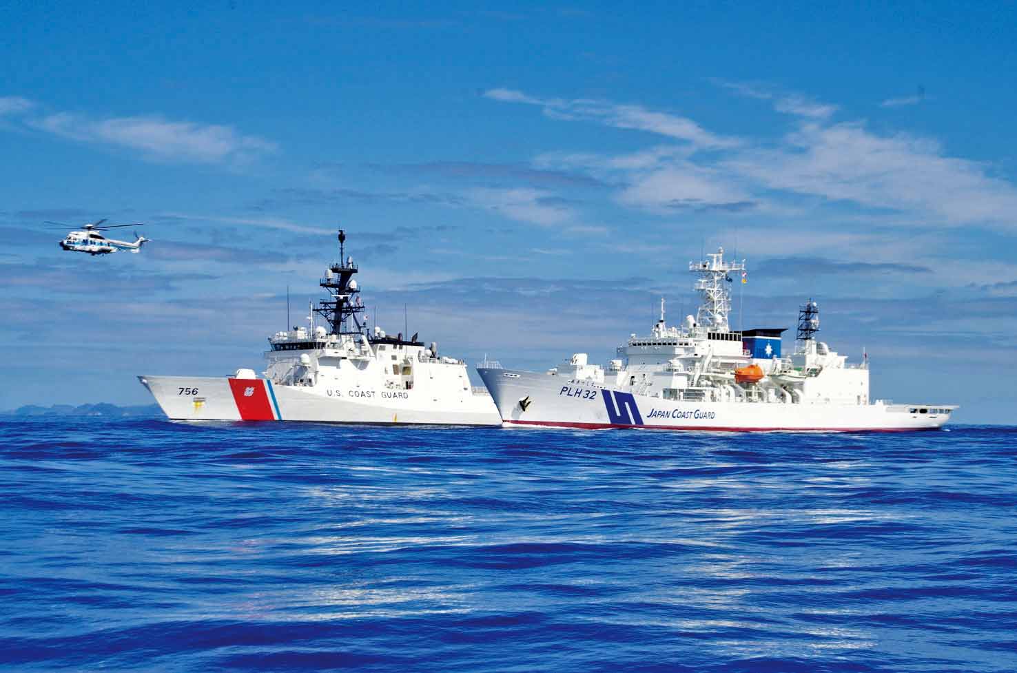日本海上保安厅舰艇(右)与美国海岸警卫队舰艇举行联合演习。