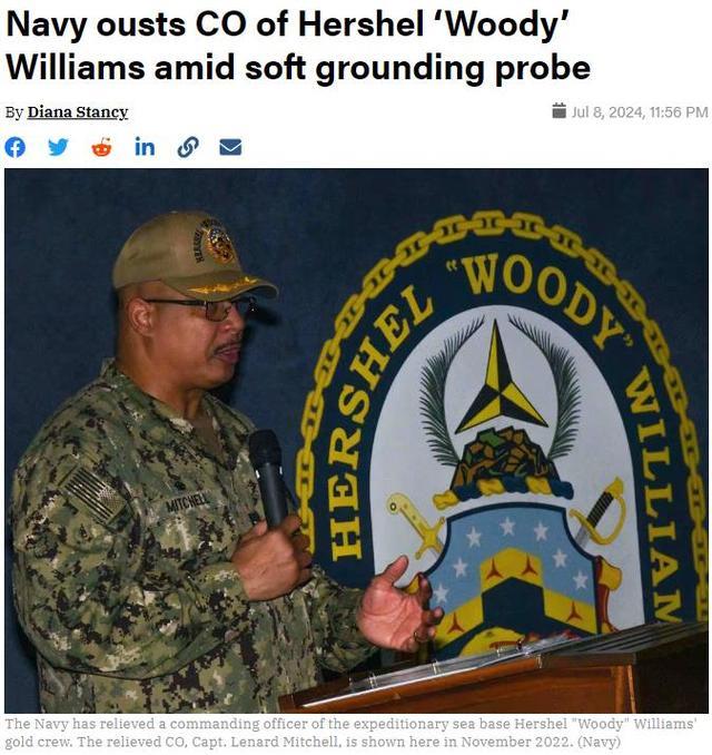综合美国军事网站“任务与目标”(Task and Purpose)和《海军时报》报道,美国海军8日宣布解除“赫谢尔·伍迪·威廉姆斯”号远征移动基地舰舰长的职务。报道称,该舰今年5月在西非海岸发生搁浅事故,相关调查至今仍在进行中。