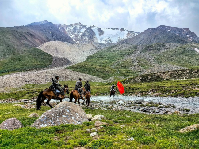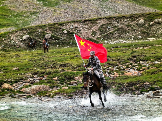 近日,武警兵团总队某支队组织党员代表走进中哈边境科古琴山的宏达坂惠民驿站,与新疆生产建设兵团61团护边员组成党员巡逻队,对执勤点15公里范围内的山地峡谷进行联合巡查,以实际行动守卫边疆安宁。(作者:黄超 摄影:黄超、任勇、马天培)