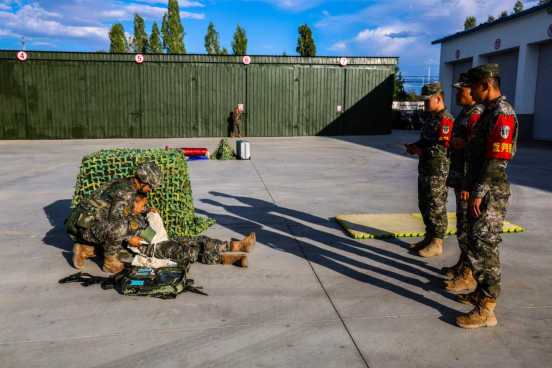 战场救护比武中,比武人员正为“伤者”包扎伤口