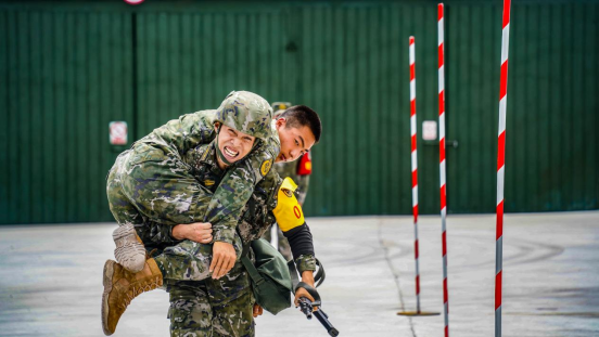 比武人员背起“伤员”向终点奋力冲锋