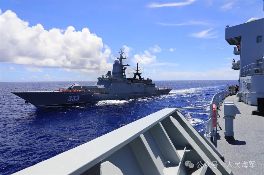微山湖舰与俄“完美”号护卫舰组织航行补给占位训练。马天傲 摄