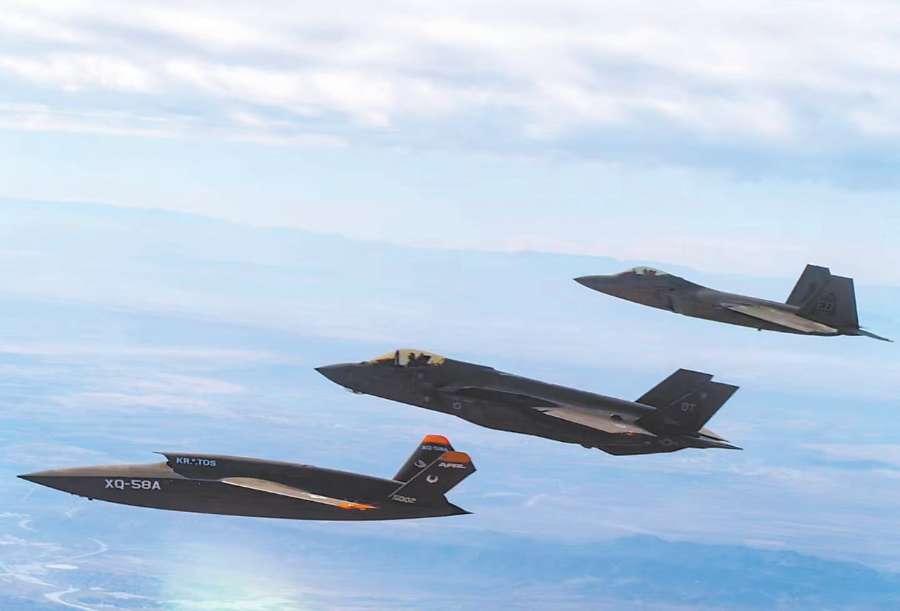 XQ-58A无人机与美国F-22、F-35战斗机进行编队测试的资料画面