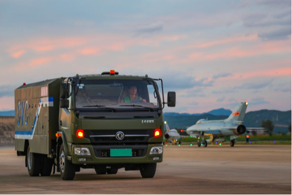 精心保障,托举战鹰高飞。战机完成训练课目后陆续返航,油、氧、电、氮等多型保障车辆快速运转实施补给,为战机再次出动做好准备……