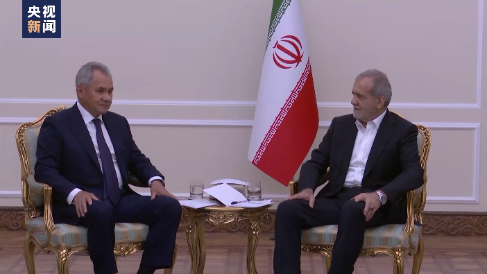 当地时间8月5日,伊朗总统佩泽希齐扬(右)在德黑兰会见了到访的俄罗斯联邦安全会议秘书绍伊古(左)(来源:央视新闻)