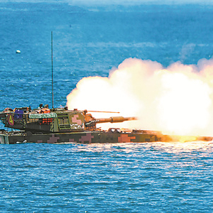 进攻途中,“敌”火力点实施拦阻射击。两栖战车快速变换战斗队形,并释放烟幕弹进行隐蔽,随即对“敌”火力点展开反击。瞄准、测距、锁定、击发……波峰浪谷间,一发发炮弹脱膛而出,直击目标。