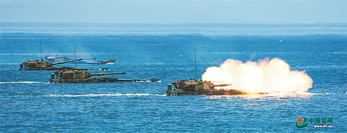 铁甲踏浪,炮声轰鸣。炎炎夏日,东部战区陆军某旅开展海上训练,锤炼两栖分队综合作战能力。