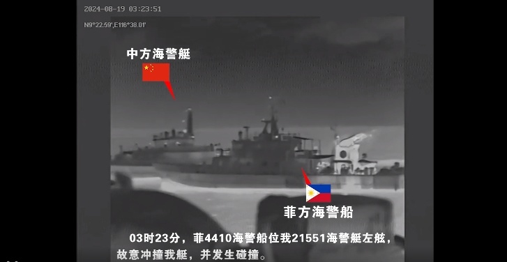 根据中国海警公布的现场视频,在8月19日凌晨3时24分和3时25分,菲4410号海警船接连两次,在中国海警21551艇左舷发起冲撞。通过船舶尾流可以看到,3时24分,菲4410号海警船是在中国海警21551艇已经减速的情况下,以加速状态实行冲撞。而在3时25分,菲4410号海警船面对中国海警21551艇的跟监,则是突然转向冲撞中方海警艇。