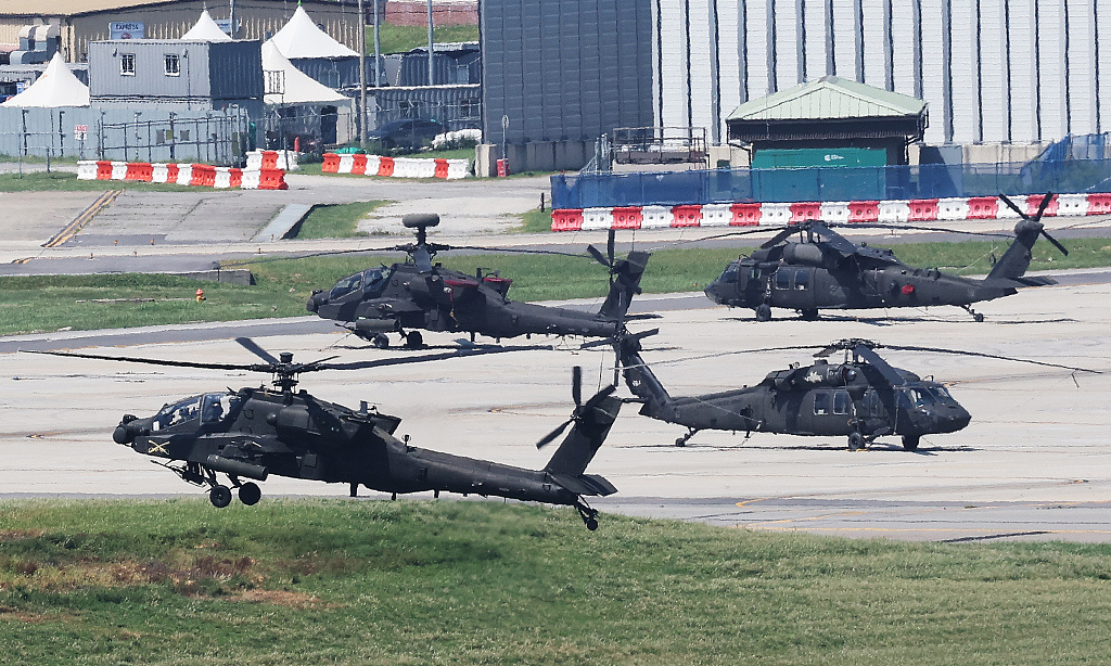 资料图:8月19日,韩国京畿道平泽市,驻韩美军基地“汉弗莱营”,阿帕奇直升机正在待命。(视觉中国)