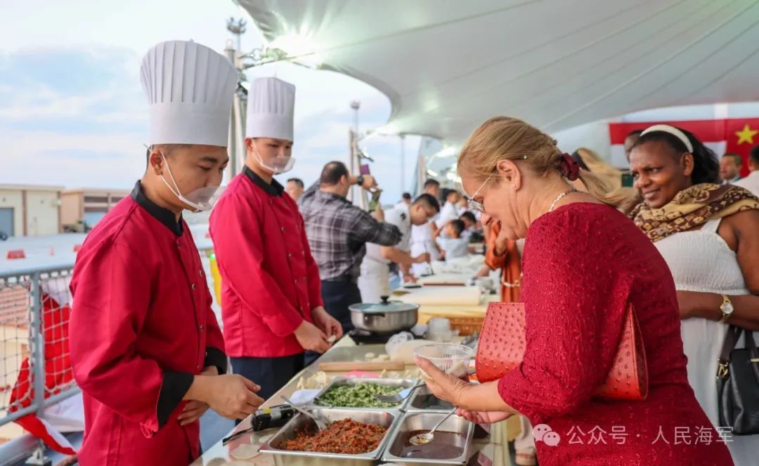 焦作舰举行甲板招待会,中方官兵现场展示水饺制作过程并邀请来宾品尝。陈元增 摄