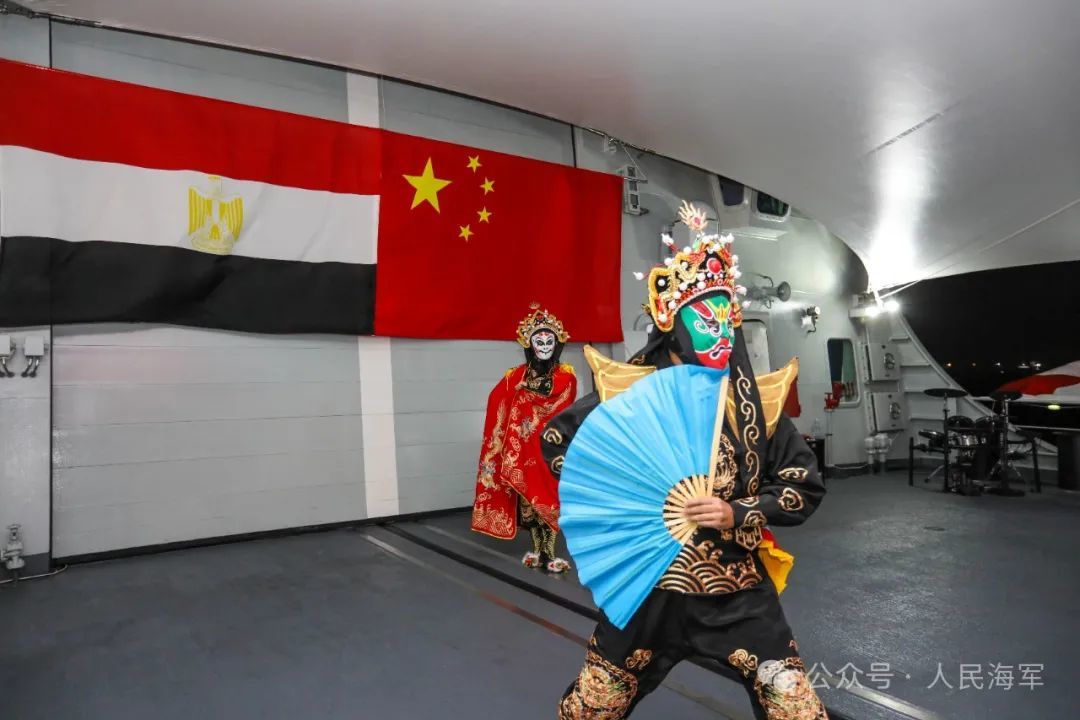 甲板招待会上,中方官兵表演川剧变脸。梁磊 摄