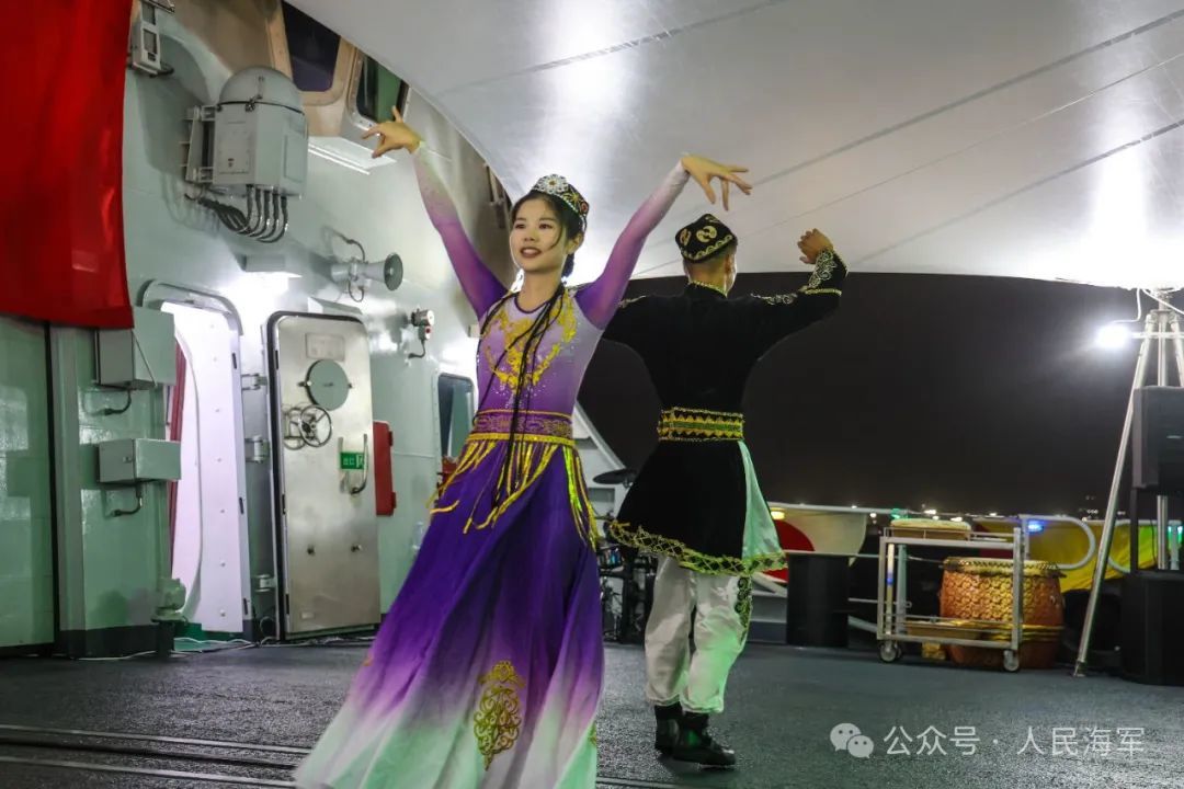 甲板招待会上,中方官兵表演民族舞蹈。张大禹 摄