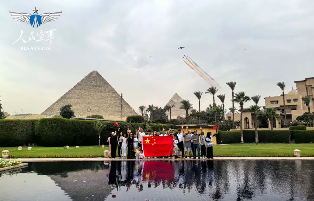 8月28日,当中国空军飞行表演编队飞越金字塔上空之际,慕名“追星”而来的在埃中国人展示五星红旗进行合影。(人民空军)