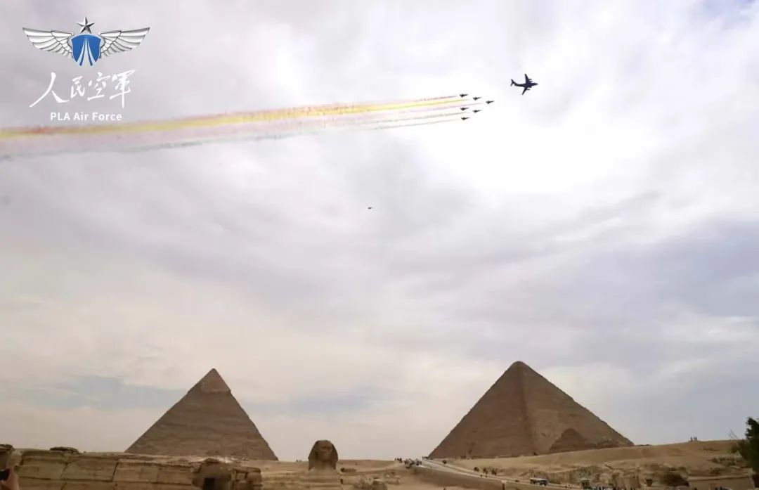 中国空军飞行表演编队26日从西北某机场起飞,跨越崇山峻岭、飞过海洋沙漠而来。抵达埃及后,中国空军飞行表演编队28日飞越金字塔上空,拉出象征中埃两国国旗颜色的六道彩烟,之后空军八一飞行表演队6架歼—10表演机编组大箭队,拉出彩烟再次飞越金字塔,运—20随后再次完成飞越。这使得今天到访金字塔的游客大饱眼福,不断挥手致意,争相合影留念。