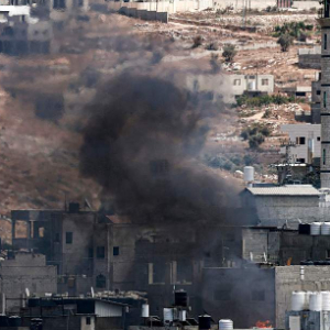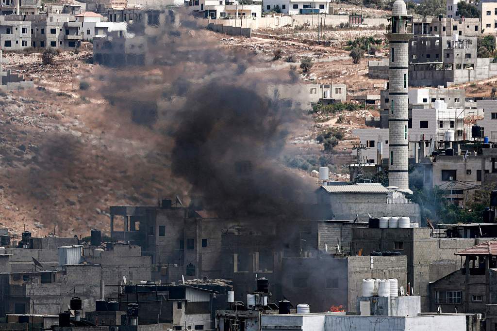 约旦河西岸图勒凯尔姆,以色列军队发起军事行动,努尔沙姆斯难民营冒出滚滚浓烟。(视觉中国)