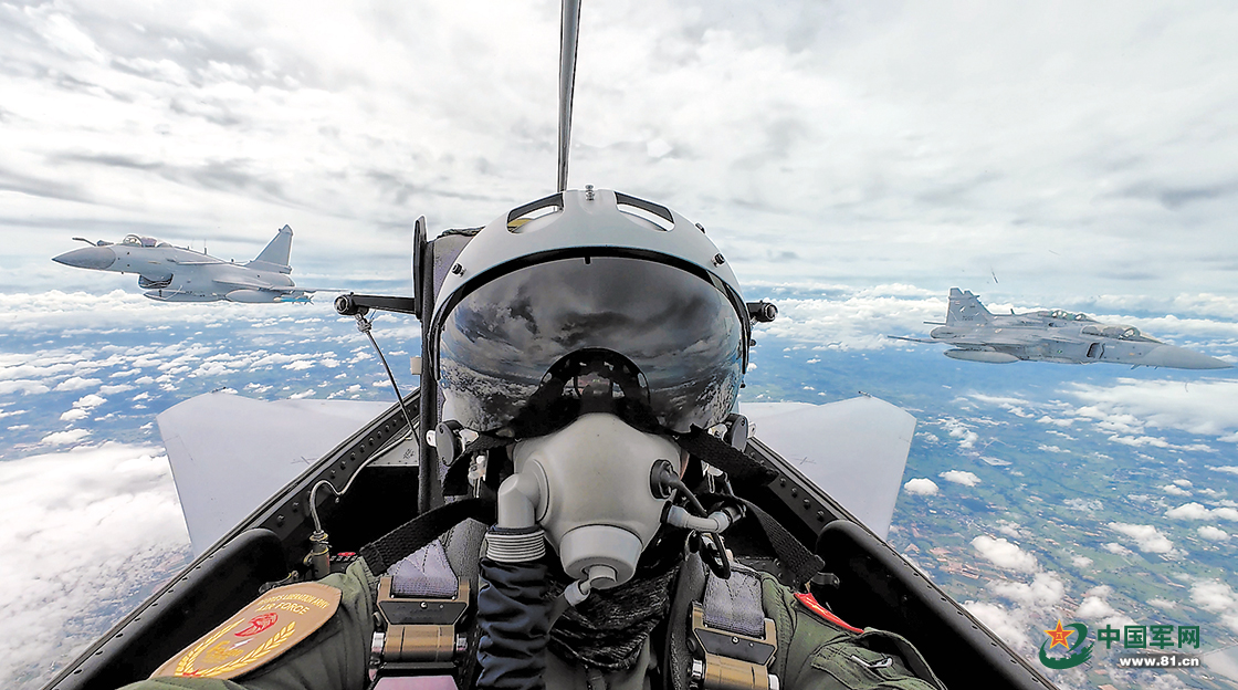 “鹰击-2024”中泰空军联合训练期间,中国空军歼-10C与泰国空军“鹰狮”战斗机编队飞行。作者提供