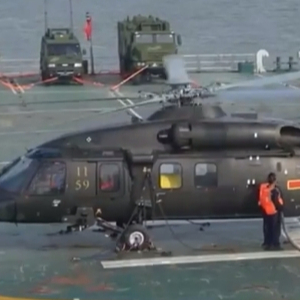 黄海某海域,陆军第71集团军某旅结合濒海驻训,组织直升机海上平台起降训练。多型直升机组成编队完成突防后,就近选择海上中继平台降落,展开油料和弹药补给,确保能快速升空再次投入战斗。