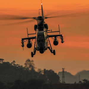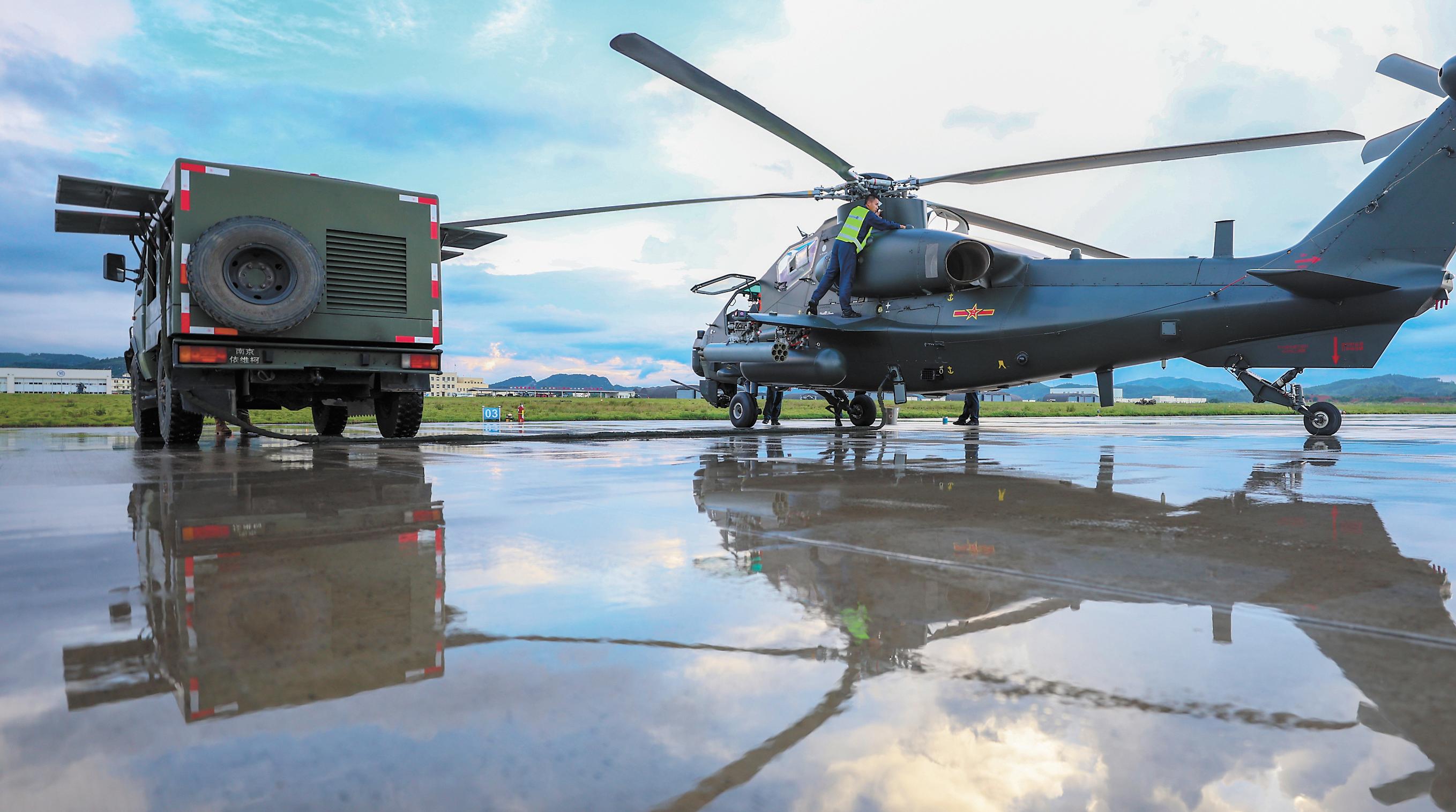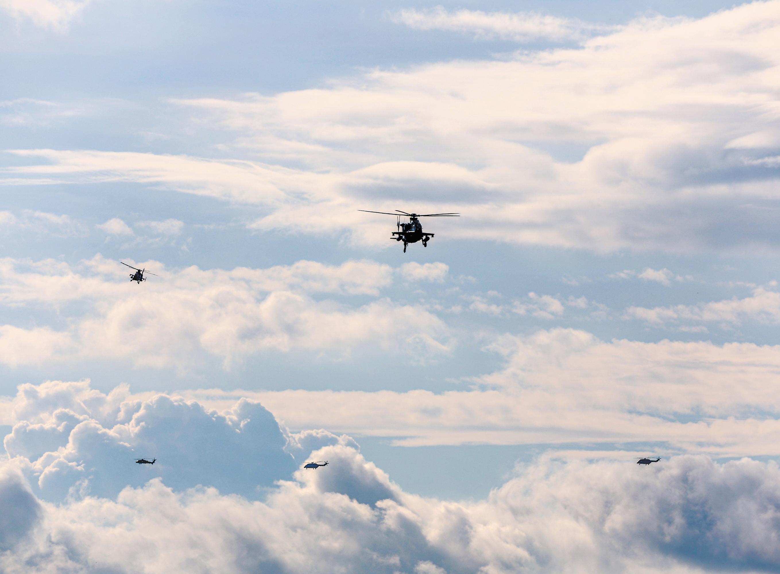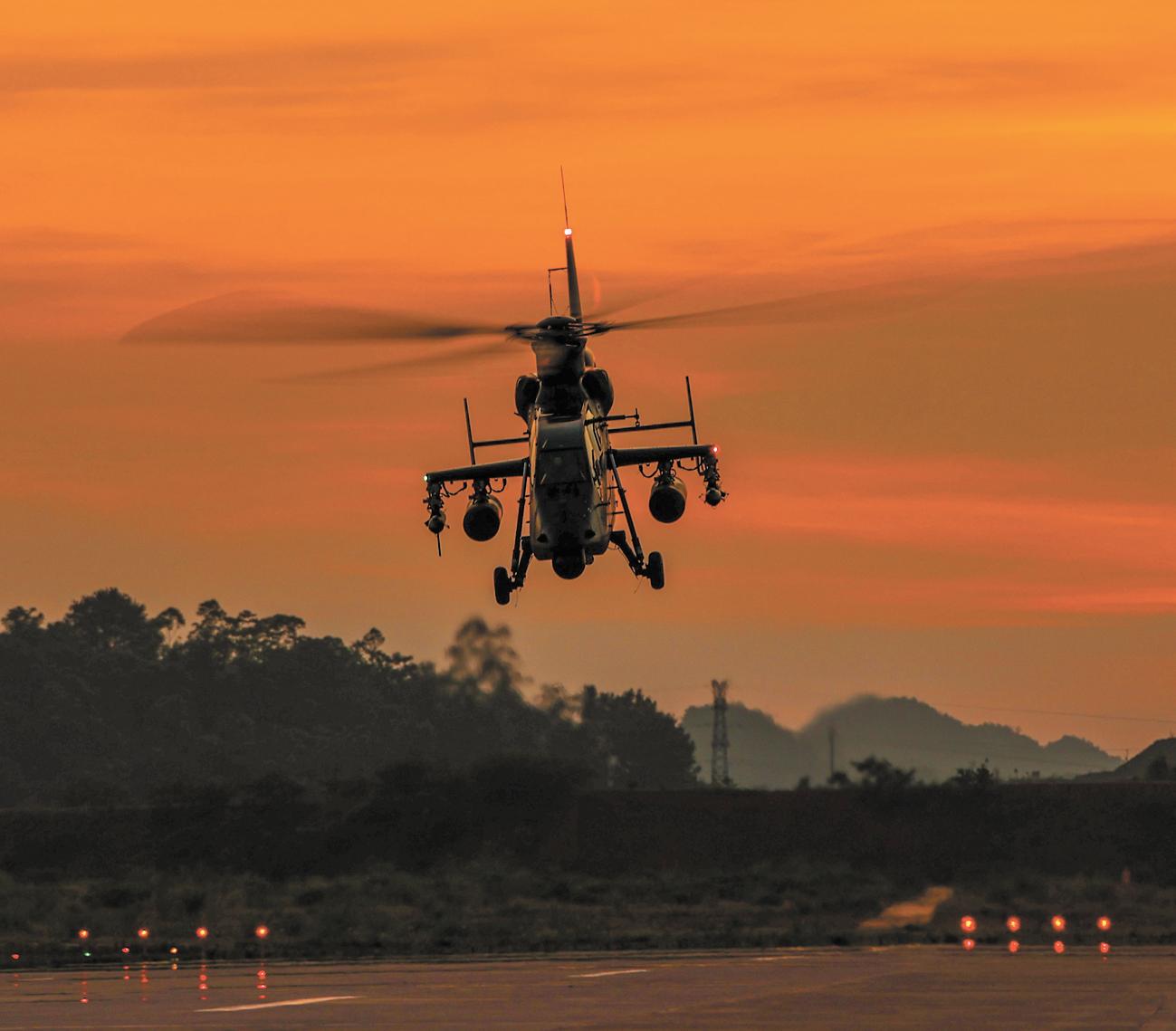抵达预定空域,侦察直升机迅速开展侦察警戒,寻找威胁目标。随后,武装直升机锁定目标。长僚机密切协同,建立攻击航线,成功对目标实施打击。