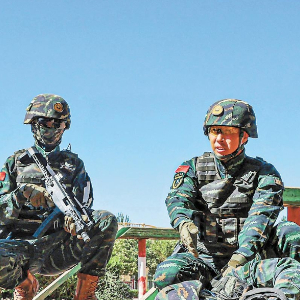 武警内蒙古总队巴彦淖尔支队某大队大队长布和图木尔(左四)正在向战友讲解战术战法。 张宇枢摄