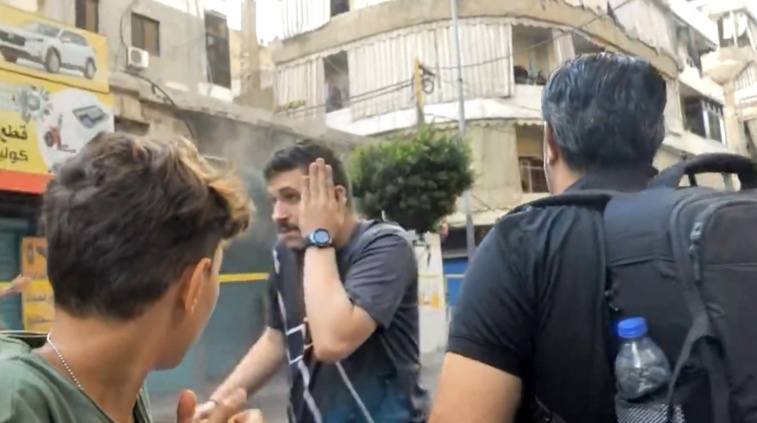 9月18日,黎巴嫩贝鲁特南部一家商店突发爆炸,画面是参加17日寻呼机爆炸事件受害者葬礼的民众对最新爆炸事件的反应。图源:ABC报道配图