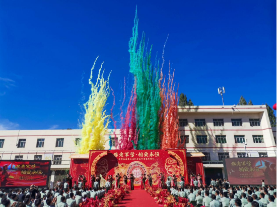 整场婚礼,红嫁衣和绿军装演绎出幸福动人的画面,官兵和家属们的呐喊声、祝福声此起彼伏,火热的军营也因这场集体婚礼变得温馨浪漫。