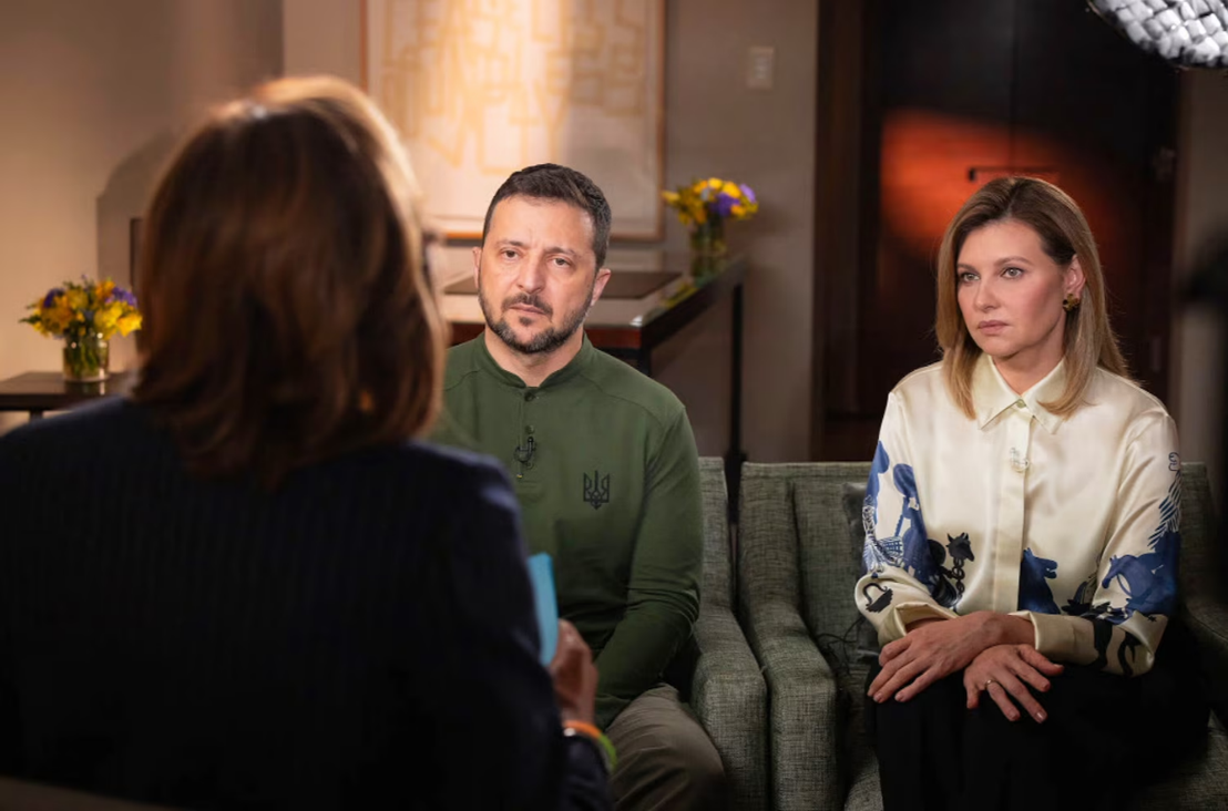 当地时间9月23日,泽连斯基与妻子泽连斯卡娅接受《早安美国》节目采访时的画面。图源:美国广播公司