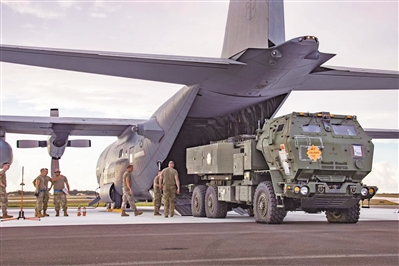 在美国关岛安德森空军基地,美军将“海马斯”火箭炮系统装载到C-130运输机上