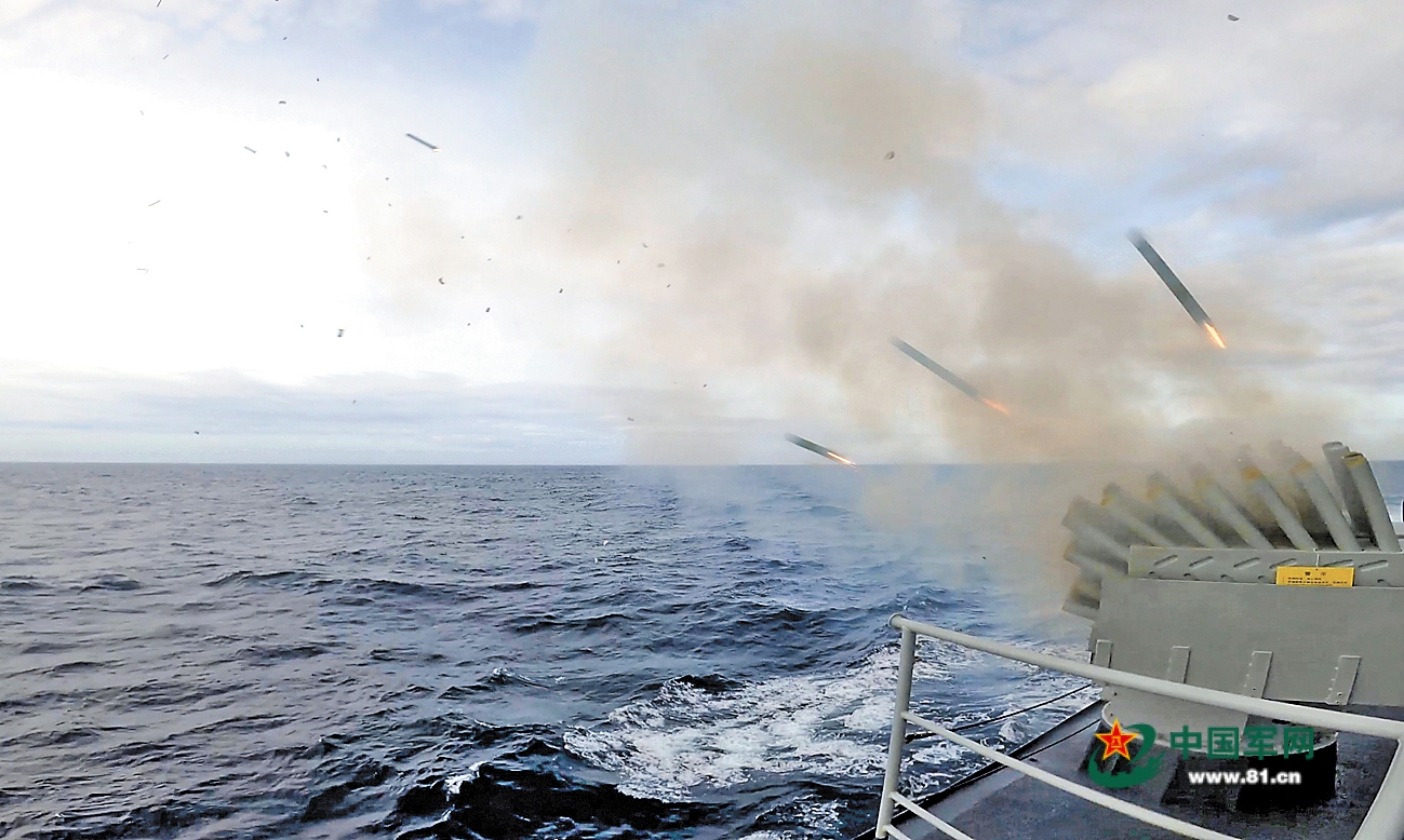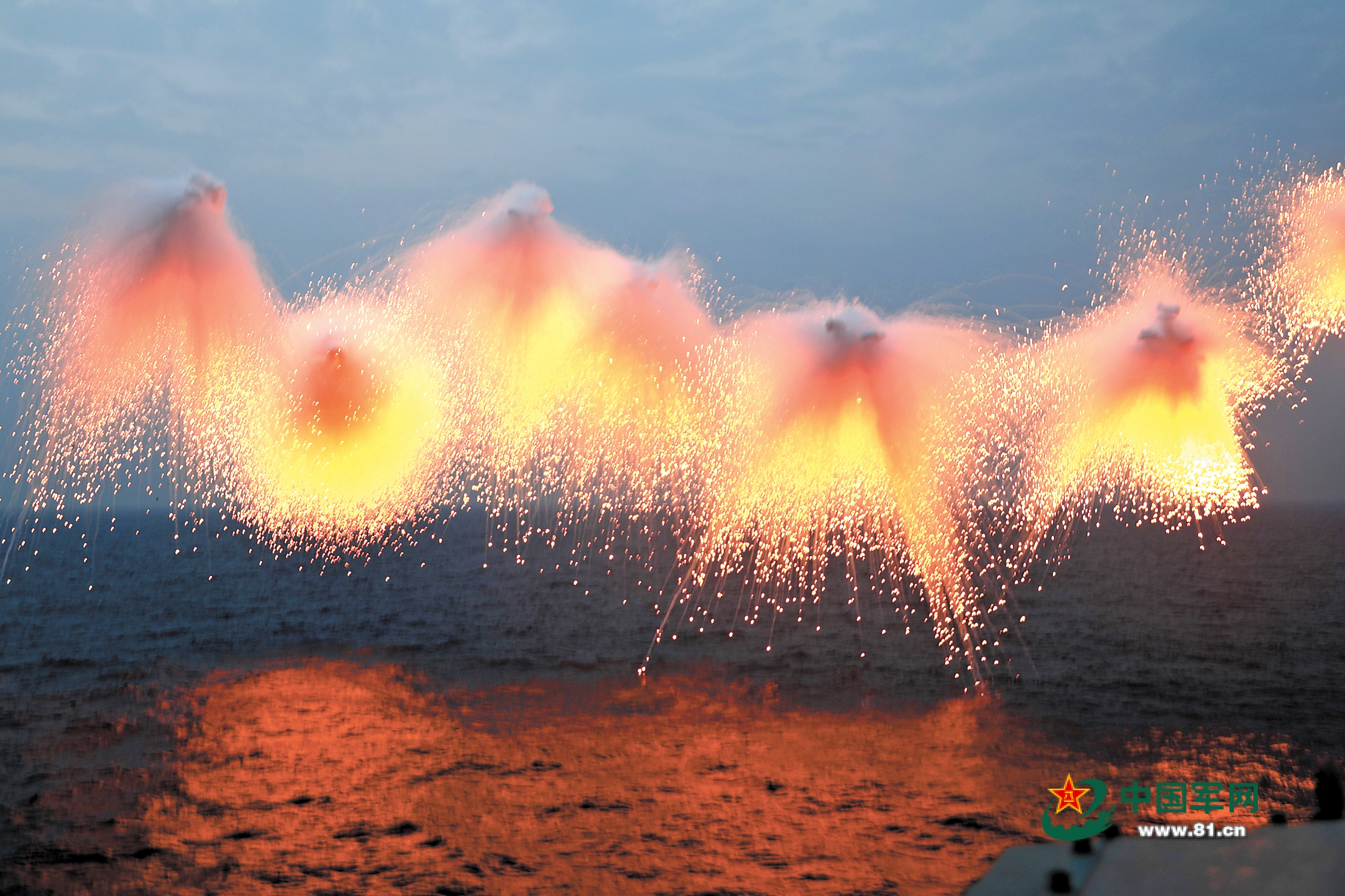 夜幕之中,考核组临机导调反潜作战特情。参训舰艇共享信息数据,快速研判目标方位。“发射!”数枚火箭深弹呼啸出膛,扑向水下目标。