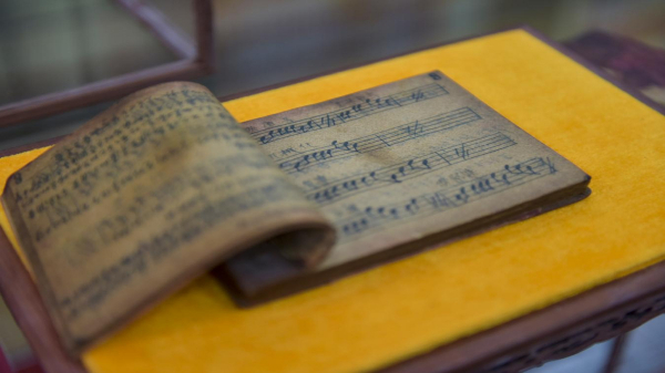 武警宁化中队原司号员李浩的爷爷捐赠的手抄军号谱。郑小强 摄