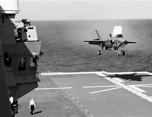 美国海军陆战队F-35B战斗机在“出云”号上进行起降测试。