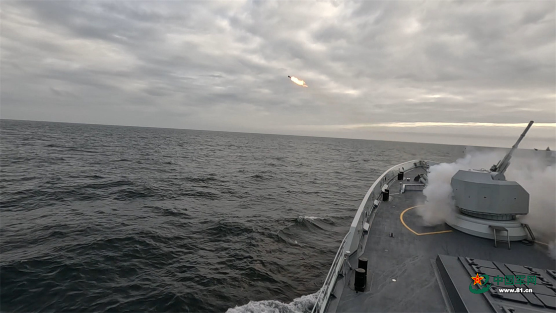 临沂舰进行实射火箭深弹课目演练。
