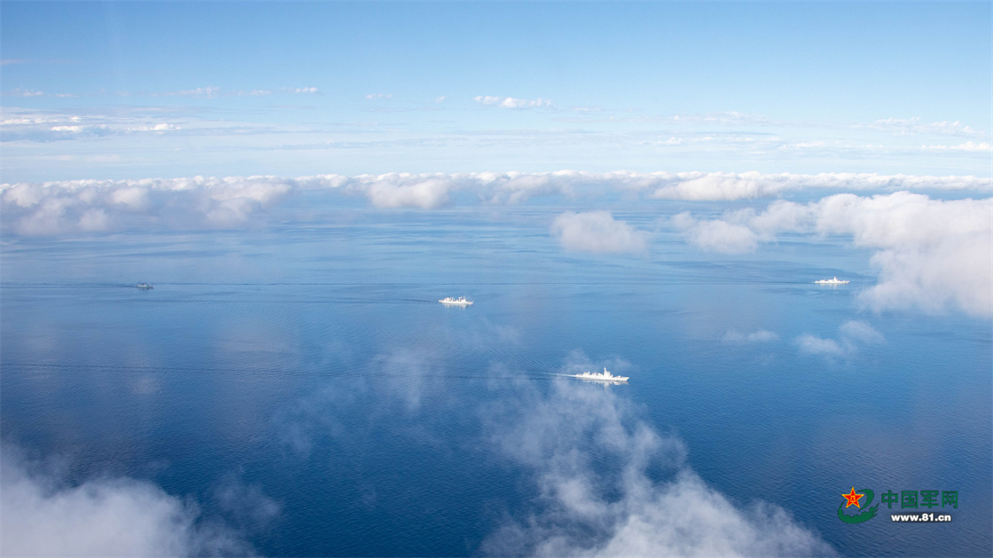 中方舰艇编队在预定海域航行。