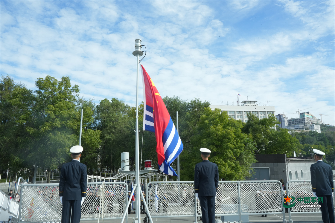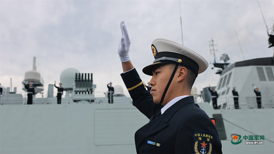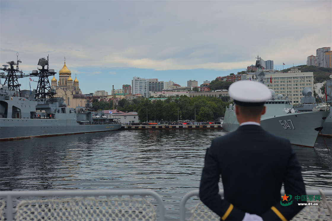 中方舰艇编队靠泊俄罗斯某军港,编队官兵挥手致意。