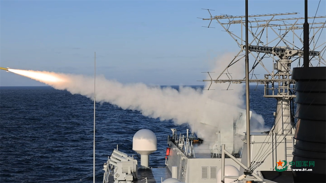 在实射近程舰空导弹课目演练中,西宁舰发射导弹。