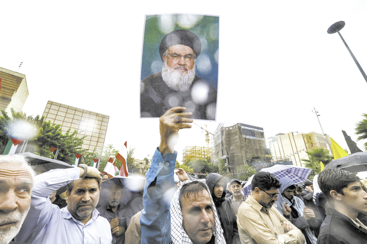 28日,伊朗民众举着纳斯鲁拉头像示威,抗议以色列。图源:外媒