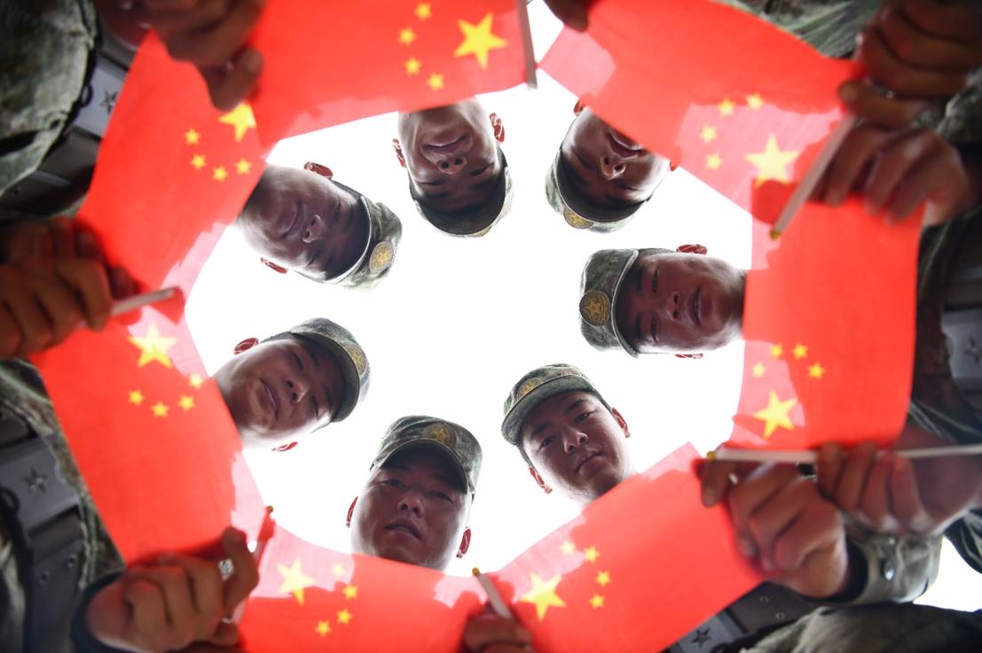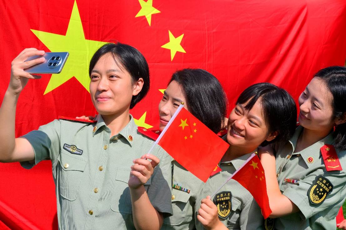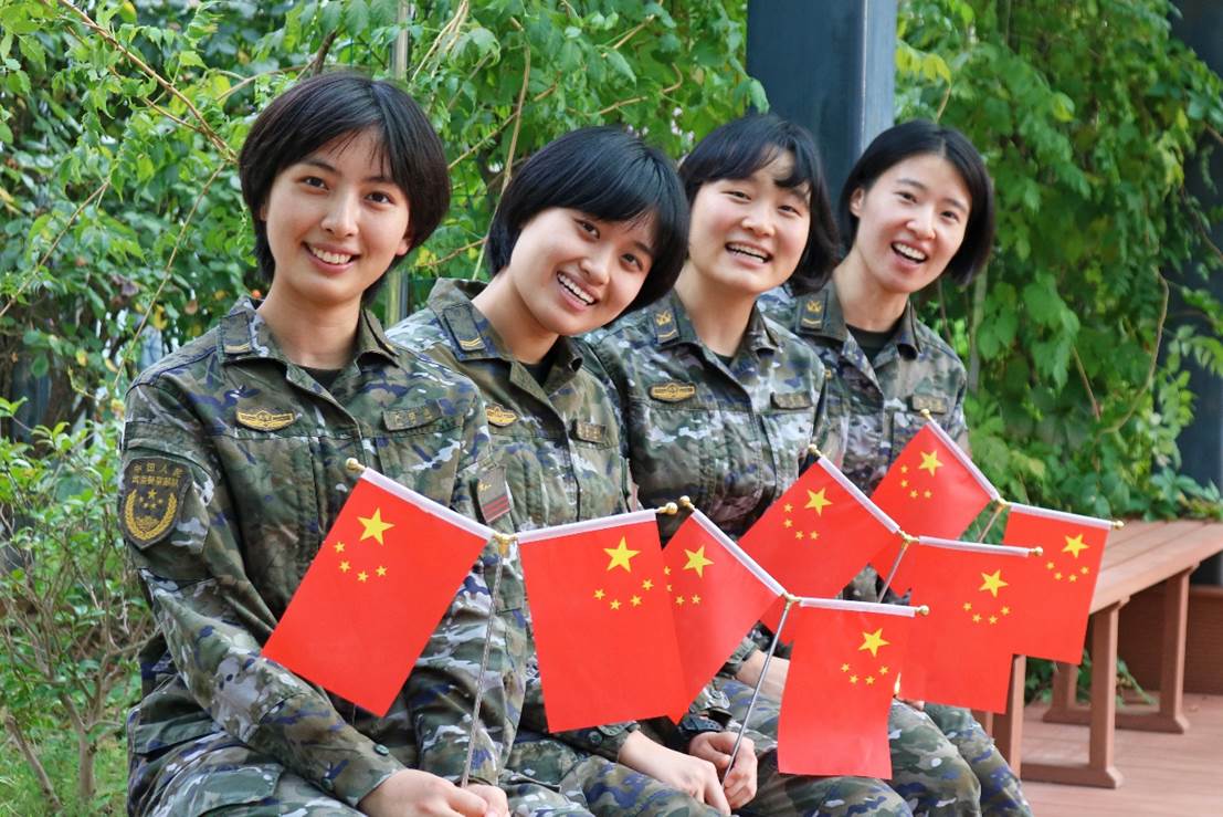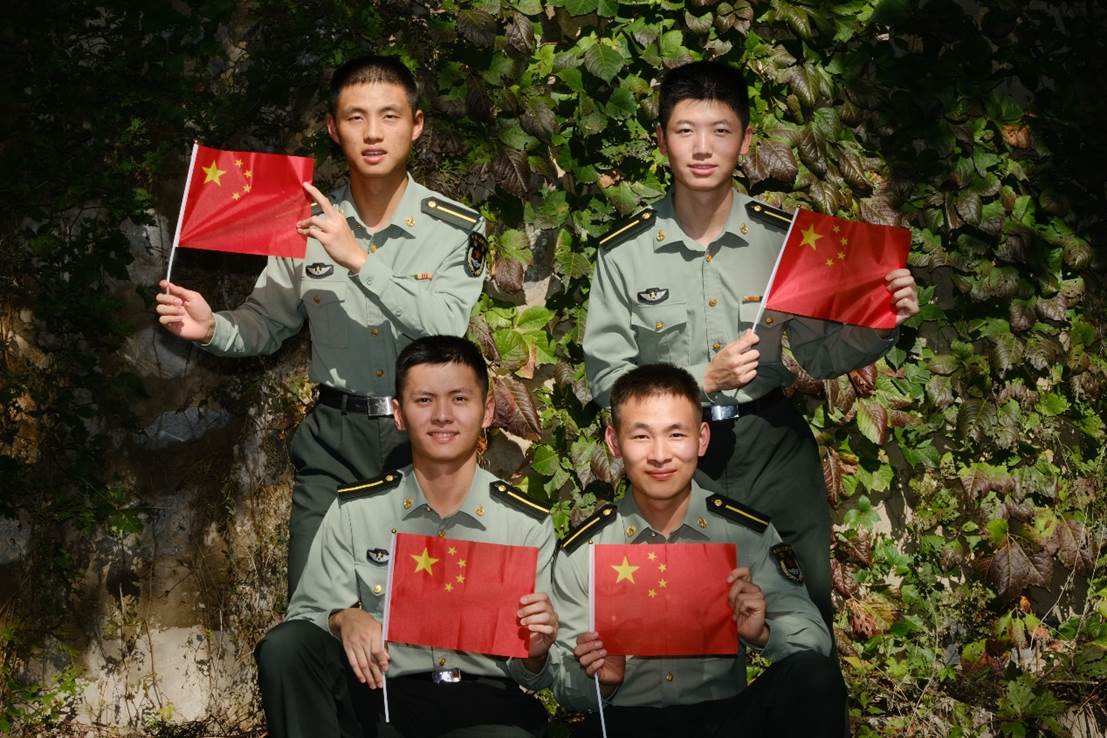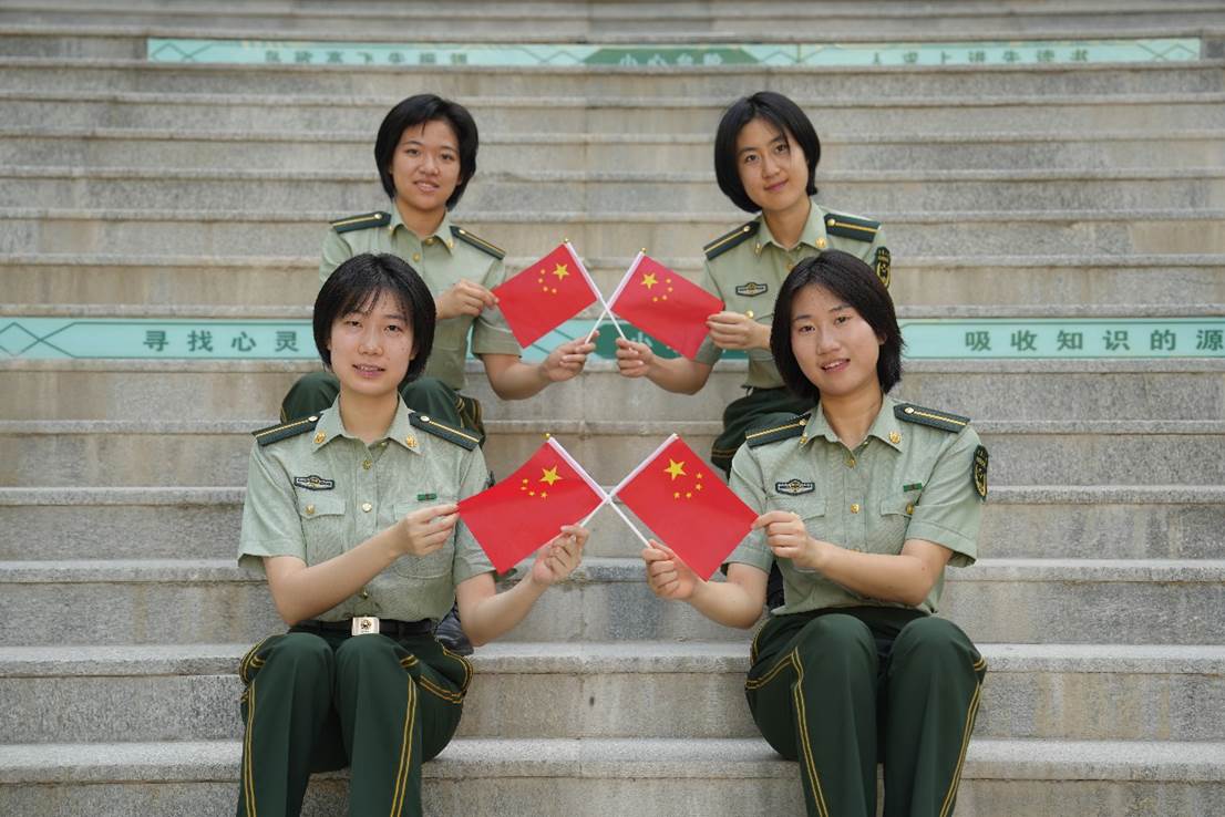 “以青春之名,书写清澈挚爱”。武警江苏总队南京支队官兵以多种形式与国旗合影,在战位告白、为祖国庆生!(杨春周、罗静)