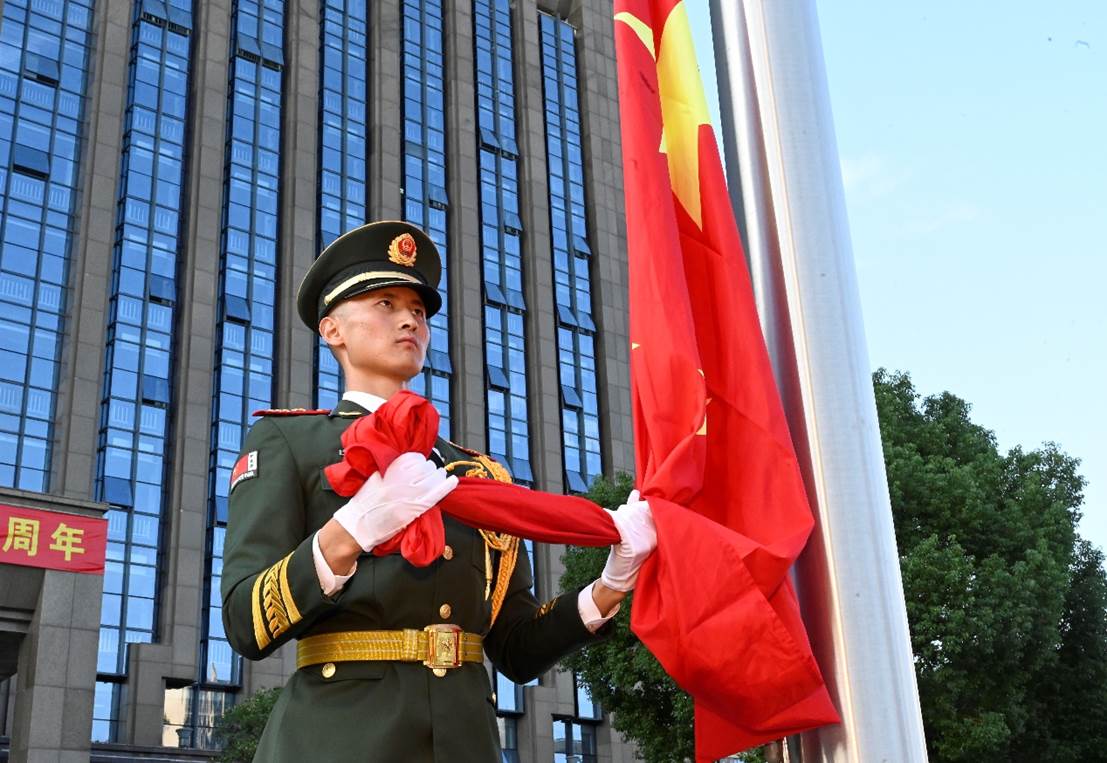 五星红旗在国歌声中冉冉升起,全体官兵肃立致敬,表达对祖国的无限忠诚与热爱。武警合肥支队誓言以实际行动践行使命,守护国家安全,为祖国的繁荣富强贡献力量。(李俊豪)