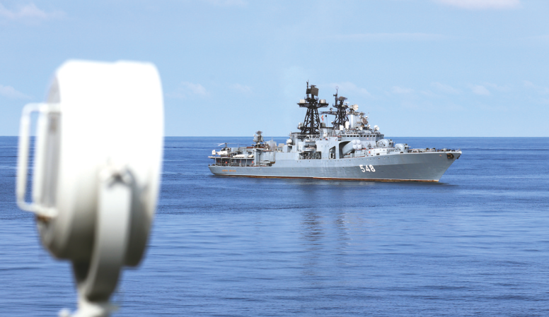 据悉,战术群内的俄方舰艇包括俄太平洋舰队“潘捷列耶夫海军上将”号和“特里布茨海军上将”号大型反潜舰,中方舰艇包括中国人民解放军海军导弹驱逐舰西宁舰和无锡舰、导弹护卫舰临沂舰,以及综合补给舰太湖舰。