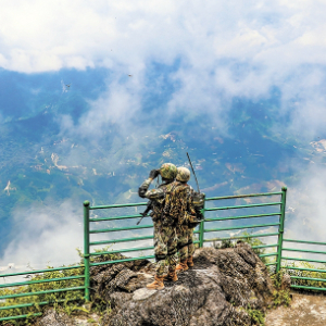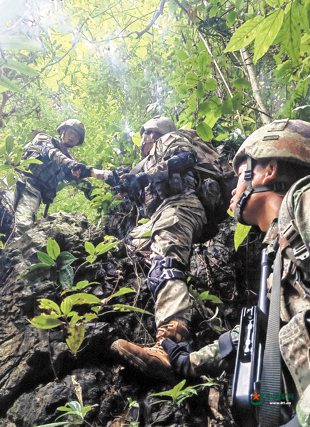南国边境的密林深处,一会儿艳阳高照,一会儿暴雨如注。地面湿滑难行,一不小心就可能摔倒甚至滚落山谷。行进时,官兵无不小心翼翼。