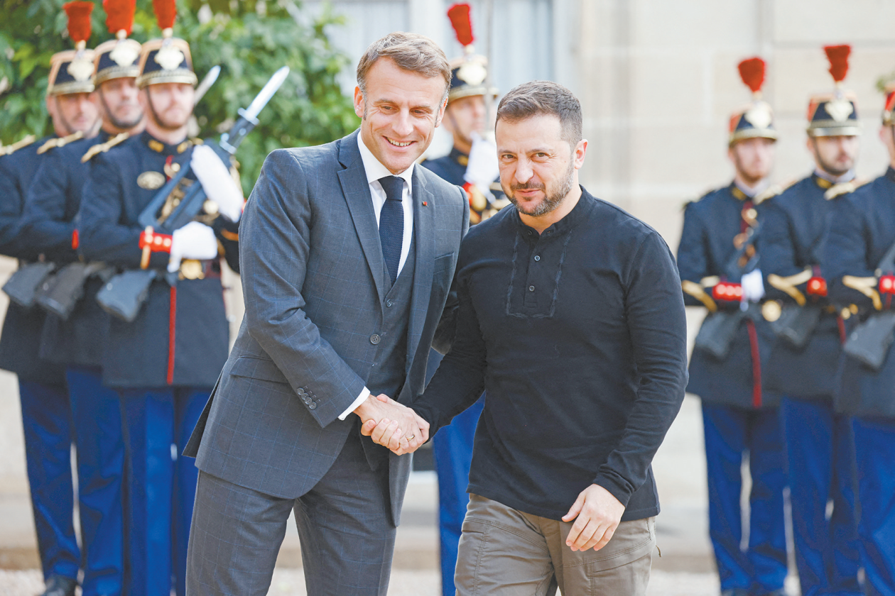 当地时间10日,乌克兰总统泽连斯基(中右)到达法国巴黎爱丽舍宫后,与法国总统马克龙握手。(法新社)