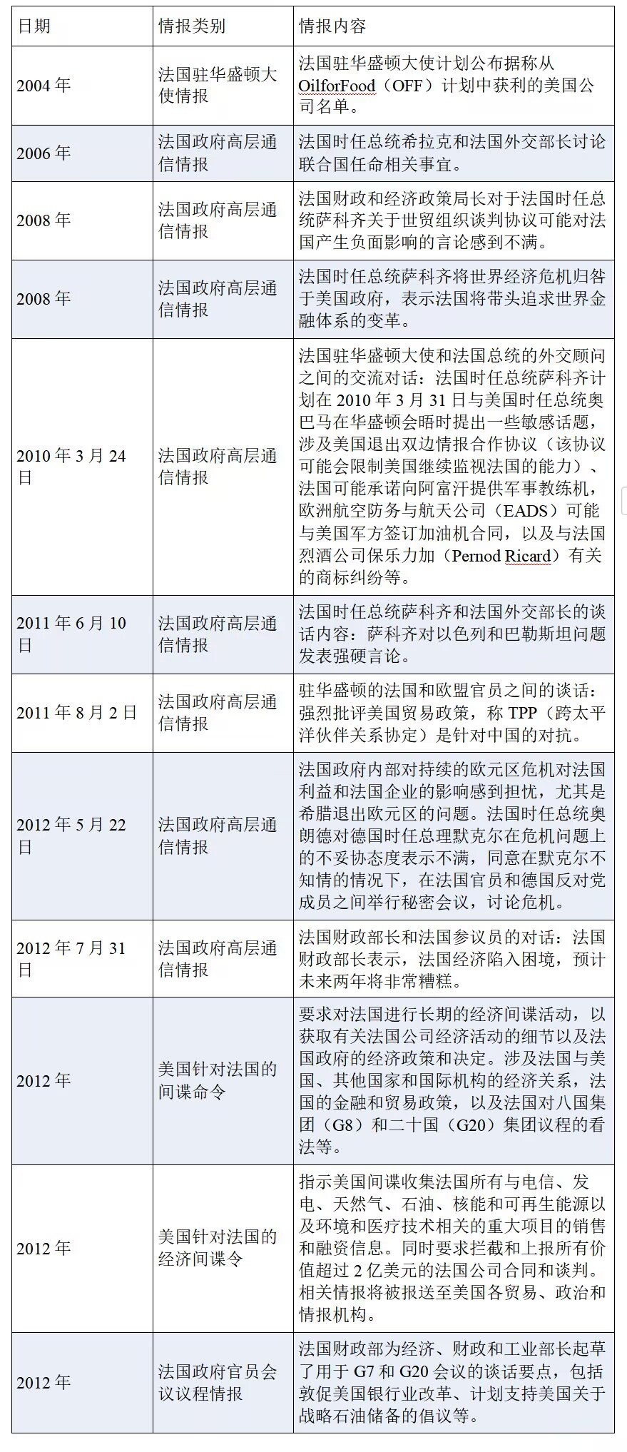 在2004年至2012年期间,美国对法国实施了长期的间谍行动,监听对象包括前法国总统、法国财政部长、法国外交部长、法国参议员、法国财政和经济政策局官员、法国驻美国大使,以及直接负责欧盟贸易政策的官员等。监听内容涉及法国政府政策、外交、金融、国际交流、基础设施建设、商业和贸易活动等,其中一些重要情报被美国授权与“五眼联盟”伙伴国家共享,揭示了“五眼联盟”国家亦为美国间谍行动的获益者。
