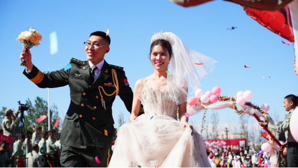 新人们在军旗下许下相亲相爱的誓言