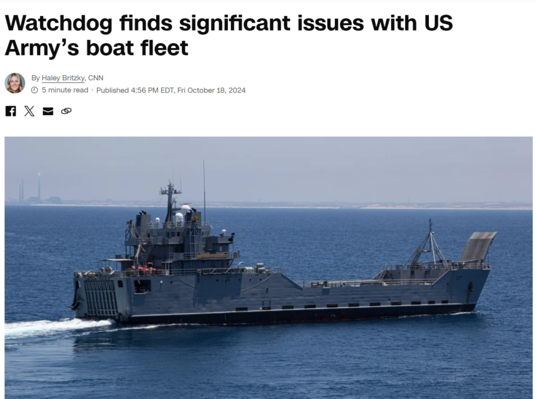 据美国有线电视新闻网(CNN)10月18日报道,本周发布的一份政府监督报告称,美国陆军后勤舰艇保养不善,基本上没有做好满足美国在太平洋日益增强的军事任务的准备。